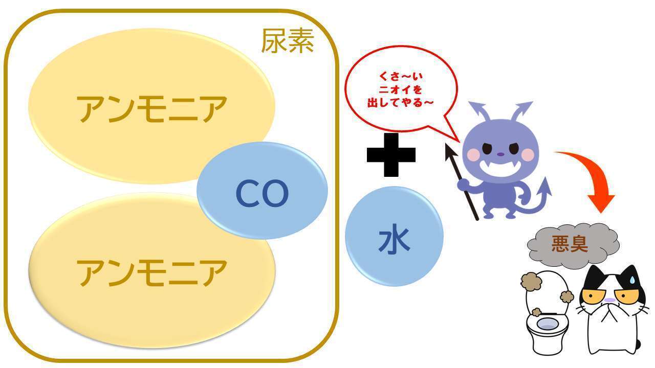 特にニオイの主犯は「おしっこ」…つまり、尿ですが、これの臭気原因の主成分は「尿素」なのです。尿素は無味、無臭、無毒の物質ですがアンモニアと炭酸ガスで構成されています。尿素はばい菌の作用で分解されてアンモニアを放出します。大便は排出直後に臭いを放ちますが、尿は排出直後には一般的に臭いません。便器周辺に潜んでいるばい菌が飛び散った尿の尿素を分解しだして臭いを放ちます。