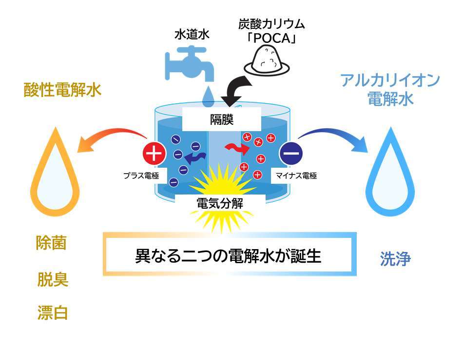 水に電気を流して電気分解することにより、アルカリ性と酸性の水溶液にわけることができます。このときにできた酸性の水溶液が「酸性電解水」、アルカリ性の水溶液が「アルカリ性電解水」です。一般的にクリーニングで使用される電解水は、「アルカリ性水溶液」が該当します。