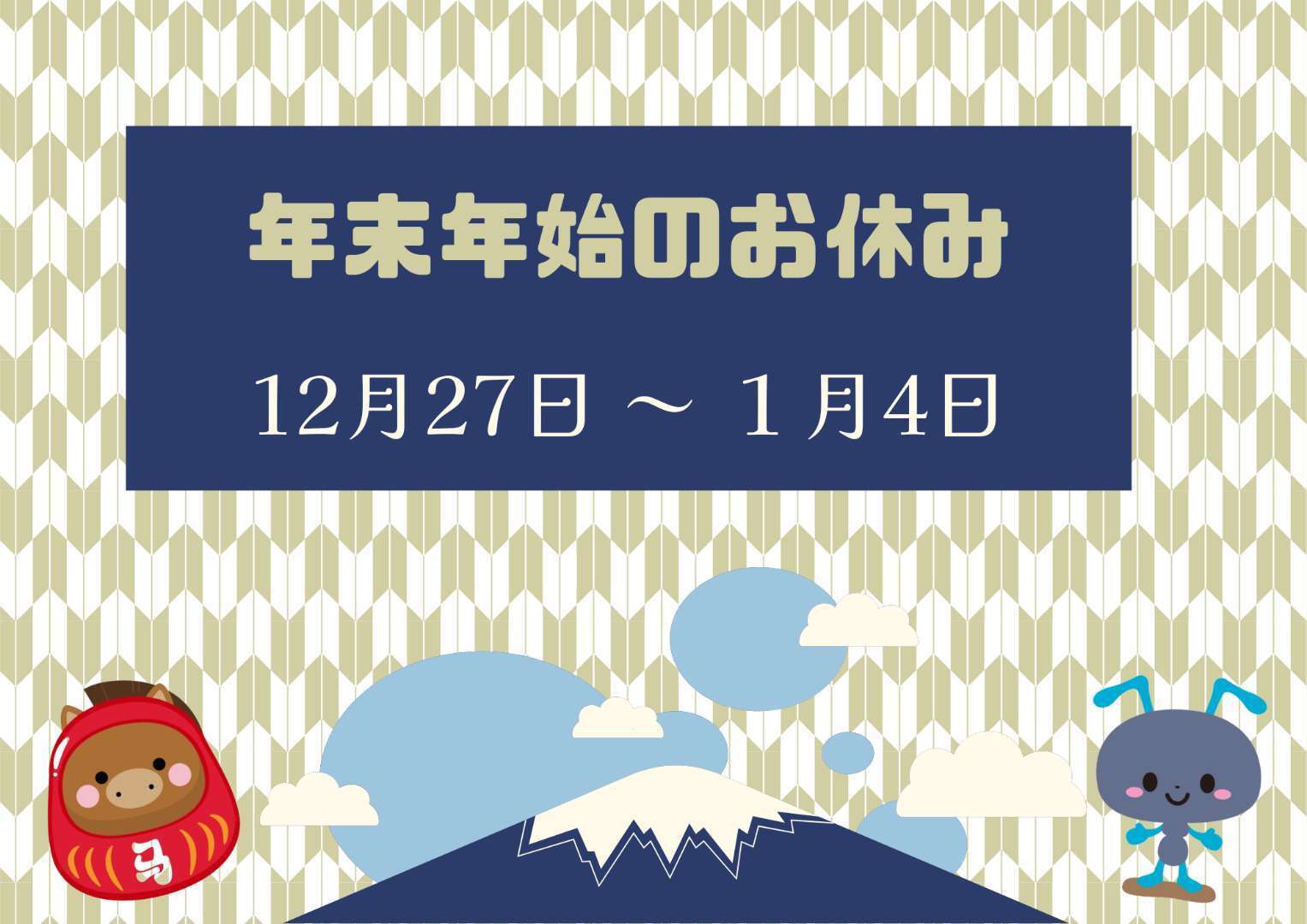 アンツでは誠に勝手ながら、年末年始休暇のため下記の通り休業させていただきます。ご不便をおかけいたしますが、何卒ご了承いただきますようお願い申し上げます。