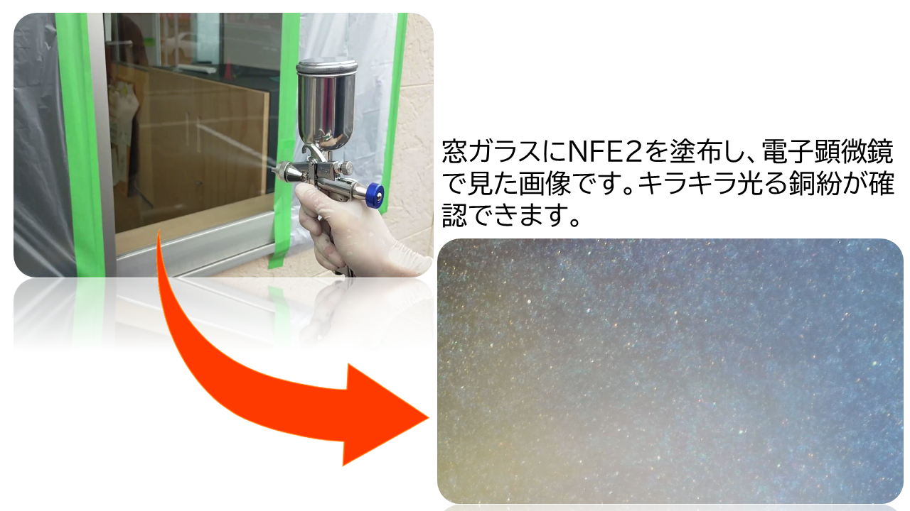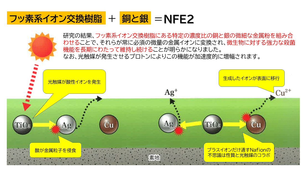 NASAが開発した燃料電池用フッ素樹脂Nafionを採用して鋭敏な可視光応答型光触媒+特殊な金属銅銀粉を組み合わせた独創技術による光触媒コーティング剤です。NFE2は目で確認できる光触媒として注目を集めています。